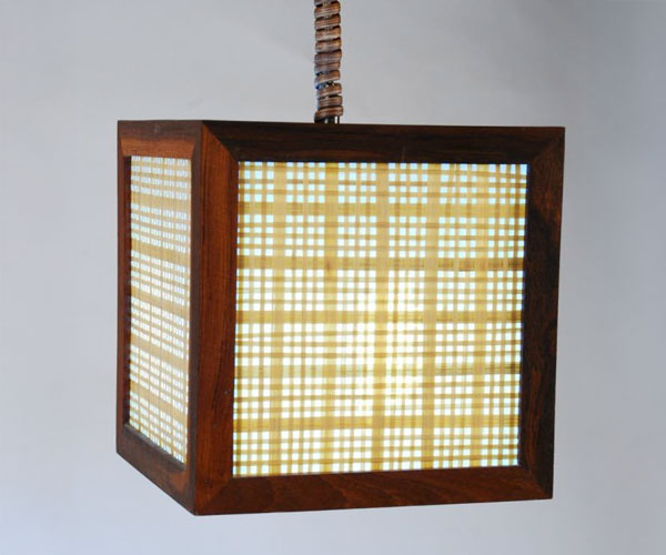 Teak wood frame with handwoven bamboo mats and handmade paper diffuser—perfect for cozy, eco-friendly interiors.