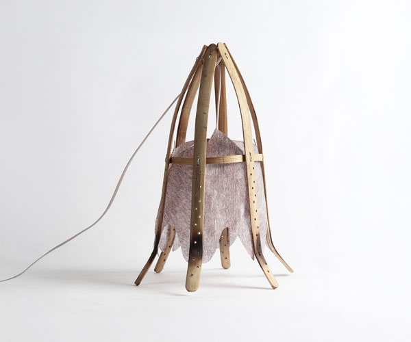 Sculptural bamboo lamp with curved legs, inspired by organic bamboo growth—usable as table or hanging light.