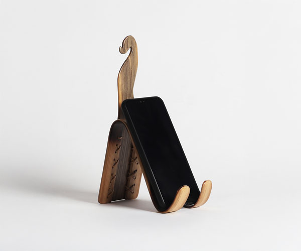 Heat-bent bamboo stand with cane-thread stitching—perfect for hands-free mobile use at home or office.